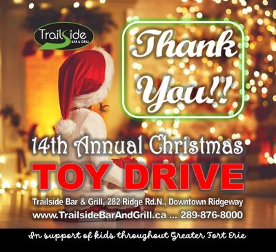 Hi guys - Thanks so much for your incredible support of our 14th Annual Toy Drive. Your gifts have now been sent off by express sleigh to the North Pole where the Stevensville Kinettes and their trusty elves have begun wrapping everything up. Thanks to your generosity, kids throughout Greater Fort Erie will now have a chance to celebrate their best Christmas ever. We can't express how truly grateful we are to know we can always count on you to come through when people need it most. Again, thank you for caring and having such big hearts. Trailside peeps are the best! Love you!