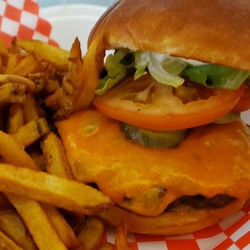Our Trailside Classic Cheese Burger & Fries - only $12! Cheddar, tomato, lettuce, onion & pickles served atop our hand-made 8oz gourmet burger!! (*Dine-in only/with purchase of a beverage)